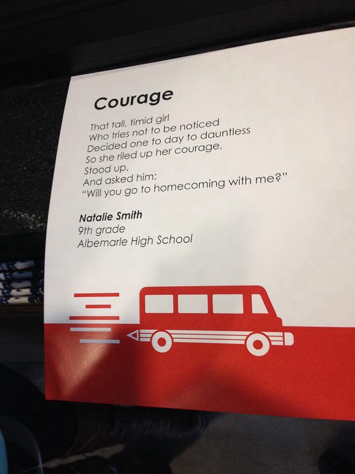 In fall 2013, my poem “Courage” was one of the winners of the Charlottesville Area Transit (CAT) Bus Lines Poetry Contest. For a year, a copy of the poem was placed on one of CAT’s buses for bus riders to read and another copy was sent to the University of Virginia’s Special Collections Library.